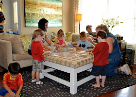 There is an unspoken birthday-present-opening protocol known only to toddlers, which I have uncovered and will now reveal to you. The role of the birthday boy is simply to tear away the restrictive covering and expose the gift. After approximately 3 seconds of two-fisting the gift to identify its contents, birthday boy drops the gift loosely to his side with a one-handed grip while looking for his next target. Birthday guest seizes the unwrapped gift from the birthday boy's hand to inspect it while birthday boy uncovers the next gift. One by one, each guest relieves birthday boy of his gifts until everyone is left with a new toy in hand. Then, they look to any nearby adult and squeek in unison, "Open it!" Fast forward through the jaws of life prying the new toys out of their packaging, and you're left with a group of content toddlers.